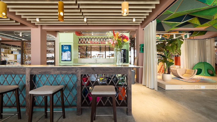 Het interieur van de nieuwe Bibliotheek Bonaire heeft een kleurrijk en lokaal geïnspireerd ontwerp. De pasteltinten van de vurenhouten boekenkasten en lokale elementen zoals de koralen en vissen die vloerkleden en wanden sieren: ze brengen het eilandgevoel bij de bibliotheek binnen. Een pergola in het interieur is geïnspireerd op de populaire lokale traditie van barbecueën onder bomen. De houten ‘boom’ in het midden van de begane grond kreeg door kinderen beschilderde ‘bladeren’; het geeft het bibliotheekinterieur een extra persoonlijk tintje.