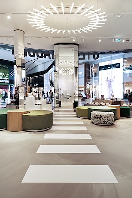 Verdere stedelijke elementen in het winkelinterieur zijn straatmarkeringen, zoals een zebrapad en gele lijnen. Aan het einde van het zebrapad verdubbelen spiegels visueel de ruimte. Met groene zitmeubels, in stof en leer, refereert concrete aan Central Park zoals je het zou kunnen zien op een luchtfoto, contrasterend met de stenige omgeving van New York.