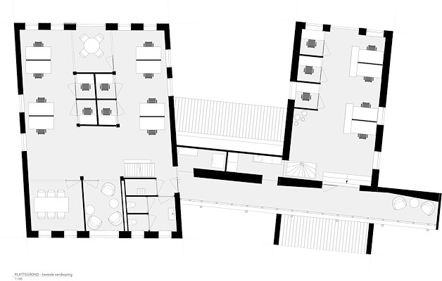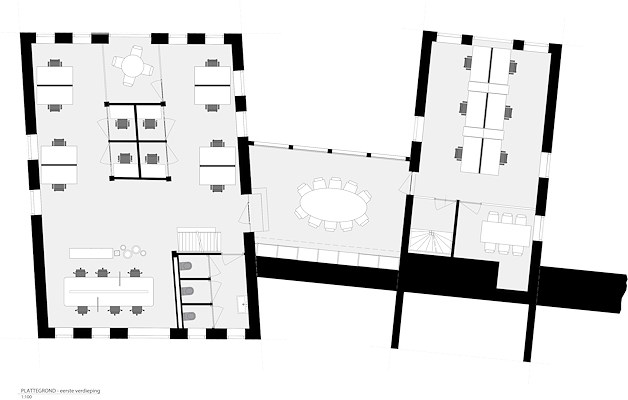 , verdeeld over de twee voormalige pakhuizen, die op meerdere verdiepingen met elkaar zijn verbonden. Op de begane grond liggen een eet-werkcafé en verschillende vergaderruimten; interactie en samenwerking staan in deze open ruimte centraal. Op de verdiepingen zijn werkplekken voor samenwerking en concentratie gerealiseerd. Hoe hoger in het gebouw, hoe meer de rust regeert. Op zolder komen stiltewerkplekken in een bibliotheek met boeken van beide organisaties.