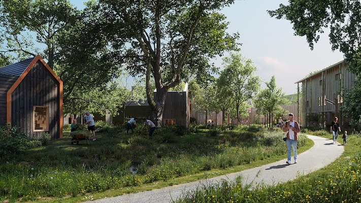 De landschappelijke structuur van de wijk is ontworpen door Strootman Landschapsarchitecten, waarbij de bestaande natuur de basis vormt. De waardevolle bomen blijven behouden en bepalen mede de contouren van de bebouwing, leggen de ontwerpers uit. “De wijk ademt rust, ruimte en verbondenheid – met elkaar én met de omgeving”, aldus het team.