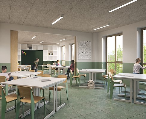 Op de begane grond komen flexibel te gebruiken leslokalen die twee aan twee gekoppeld kunnen worden. Negen lokalen liggen rond een multifunctionele zaal, waarbij beglaasde wanden zorgen voor visueel contact tussen de zaal en de omliggende lokalen. De multifunctionele ruimte fungeert mede als circulatieruimte, waardoor een compact gebouw zonder nodeloos lange gangen wordt gecreƫerd, zo legt het architectenbureau uit.