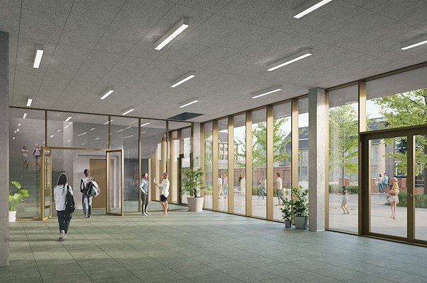 Het gebouw krijgt ƩƩn duidelijke entree vanaf het Burgemeester Bertenplein, met een overdekte zone voor de ingang. Een verticale circulatiekern met trap en lift verbindt alle verdiepingen van het schoolgebouw met elkaar, alsook de verdiepingen van het naastgelegen, monumentale Sint-Janscollege.