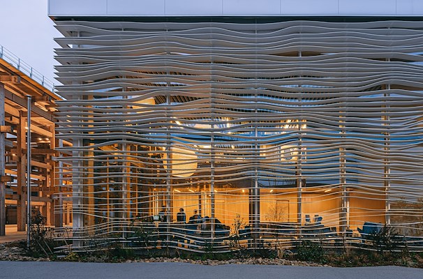 . Het paviljoen, met een gevel van golfende lamellen en een lichtgevende bol in het hart, heeft ‘common ground’ als thema.