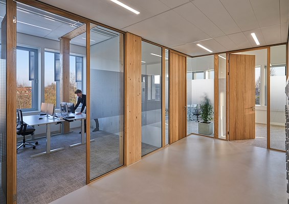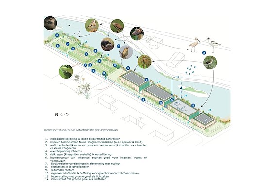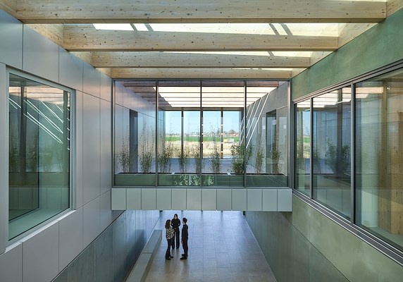 Tegelijkertijd dragen de lichthoven bij aan een goede daglichttoetreding en gezonde werkomgeving, én versterken ze de relatie van het gebouw met het omringende natuurgebied. Het ontwerp is stevig verankerd in het omliggende veenpolderlandschap van Westzaan. De natuurinclusieve inrichting is gebaseerd op lokale flora en fauna en houdt rekening met klimaatverandering, vertelt Studio Prototype. Het landschapsontwerp is gemaakt door Dijk&Co landschapsarchitectuur en uitgevoerd door Donker groep.