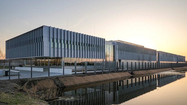 Het zilvergrijze gevelmateriaal weerspiegelt de tinten van de groene oever langs het complex en verzacht zo de grens tussen gebouw en natuur. De lichthoven en de gelaagde lamellengevel, waarachter de kantoren zijn gesitueerd, creëren zo een beschermde en groene, aangename werkomgeving.
