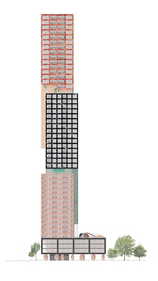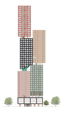 Om bij dit project met hoge dichtheid ook gemeenschappelijkheid te creëren, hebben de architecten een sterke nadruk gelegd op collectieve ruimten in de hele toren. Tussen de gestapelde volumes zijn ruimten ontworpen, die fungeren als de ‘verticale tegenhangers’ van openbare voorzieningen in het stratenplan van een stad, zoals pleinen en speeltuinen.