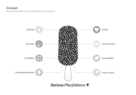 De merkidentiteit komt ook terug in de vormentaal van het interieur. Zo zijn met de herkenbare vloeiende vorm van ijsstokjes lamellen voor tussenwanden gemaakt en hebben plafondarmaturen de kenmerkende ‘swirl’ van softijs. De swirl ook terug te zien in zwierige grafische prints op de glazen wanden.