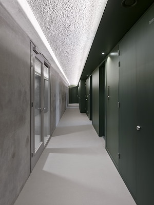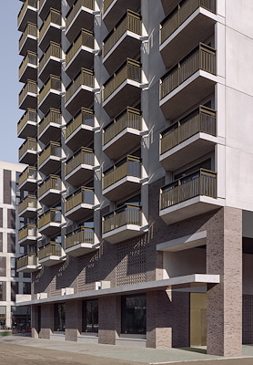 “Dat werkt door tot in de tactiliteit van de gevels. Het betonoppervlak is verrijkt met verschillende afwerkingen. Zo zijn de onderzijden van de balkons gepolijst wat, in combinatie met verschillende typen balustrades, zorgt voor een verfijnde uitstraling. De betonnen luifel rondom de plint heeft een verticale opstand, net als de borstwering van de naastgelegen flat. Aan de westzijde gaat het horizontale karakter van de gevels over in verticaliteit, waardoor de hoogte en het uitzicht richting het Sloterpark worden benadrukt.”