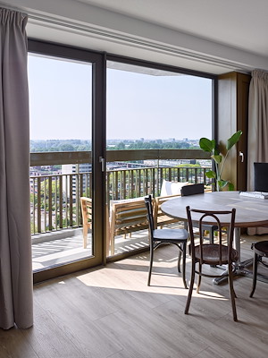 Door slim gebruik te maken van de beschikbare bouwhoogte en de strategische plaatsing van de technische installaties, zijn er binnen het bestemmingsplan nog vier extra woningen op het dak gerealiseerd, naast twee collectieve dakterrassen. Deze woningen van ongeveer 50 m2 beschikken ook over een eigen terras met een riant uitzicht. Op het dak van deze woningen liggen zonnepanelen, waardoor tezamen met de WKO- installatie het gebouw voor haar eigen energievoorziening zorgt.
