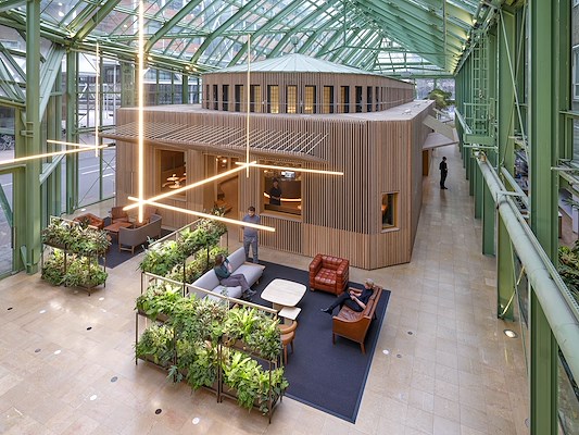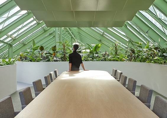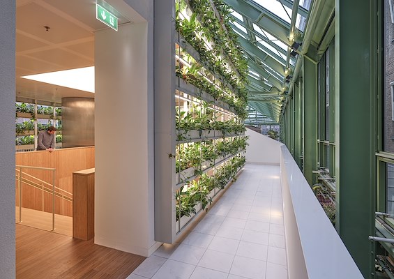 en de principes van de WELL Building Standard integraal zijn toegepast, vertellen de architecten. Het ontwerp, waarbij de Orangerie fungeert als ‘groene long’, omvat verticale tuinen en plantenwanden. Ze dragen bij aan een goede luchtkwaliteit, een aangename werkomgeving, CO2-reductie en een lagere koellast, aldus de ontwerpers.