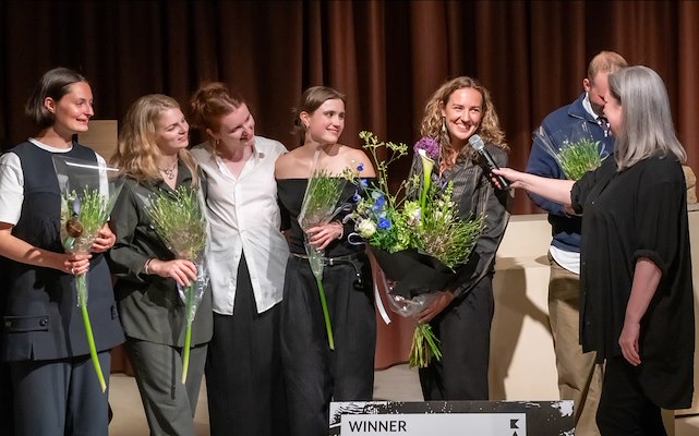 Winnaar Antonia Schreiber in gesprek met Annemoon Geurts (Creative director Kazerne Foundation). Verder op de foto van links naar rechts: genomineerden Céleste Muir, Kiki Astner, Réiltín O’Hagan, Lilou Angelrath en Jules Péan.