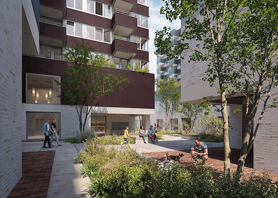 Alle woningen krijgen een eigen buitenruimte. Op de eerste verdieping dragen groendaken bij aan een aangenaam woonklimaat. Tussen en rondom de gebouwen komt een buitenruimte naar ontwerp van DELVA Landscape Architecture | Urbanism, gericht op versterking van de biodiversiteit en met veel aandacht voor lokale flora en fauna.