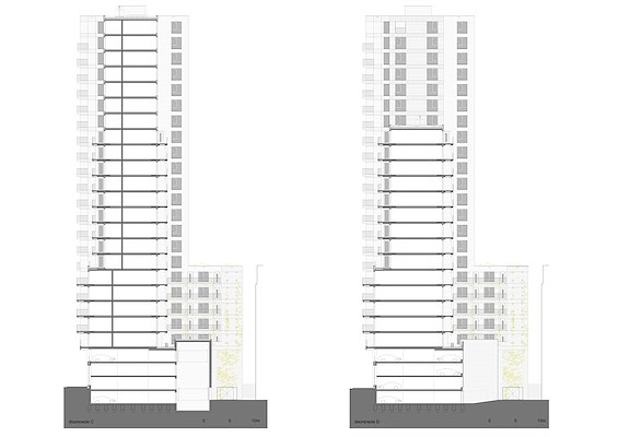 . In de stedelijke laag zijn tien woningen per verdieping ingepast; daarboven verkleint het volume en biedt het zeven woningen per verdieping. Vanaf de zestiende verdieping biedt het gebouw drie woningen per bouwlaag. De woningen zijn gericht op middenhuur en het vrije-huursegment.