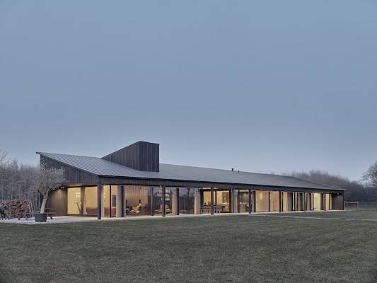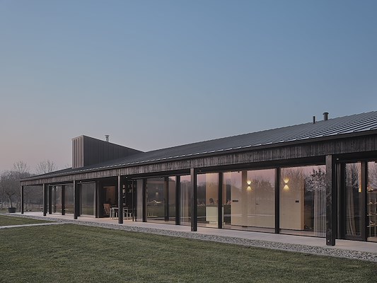 “Een wandeling door het huis voelt als een wandeling door het landschap”, vertelt het architectenbureau. De onderlinge schakeling van leefruimten resulteert in een wisselend perspectief op de omgeving. De gevels gericht op de es zijn maximaal transparant en liggen terug om de zon te weren. De overige gevels zijn relatief gesloten, bieden privacy en hebben vensters die het landschap inkaderen.