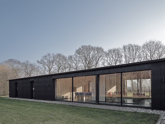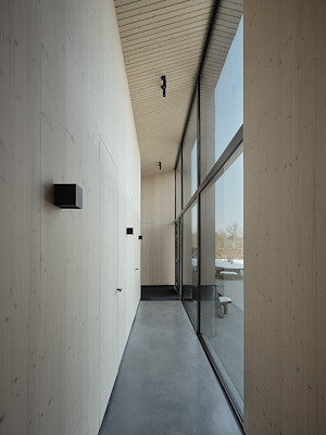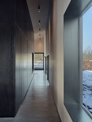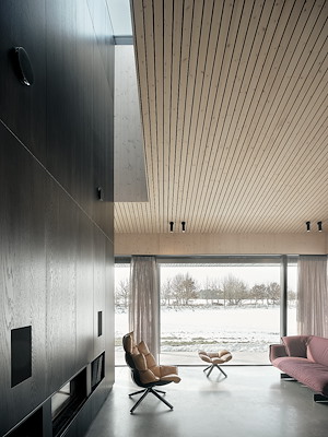De woning is volledig gerealiseerd in hout. Het interieur contrasteert door zijn naturel houten afwerking met het exterieur in zwart hout. De licht hellende daken zijn uitgevoerd in zwart zink met fijne felsnaden en een dunne dakrand.