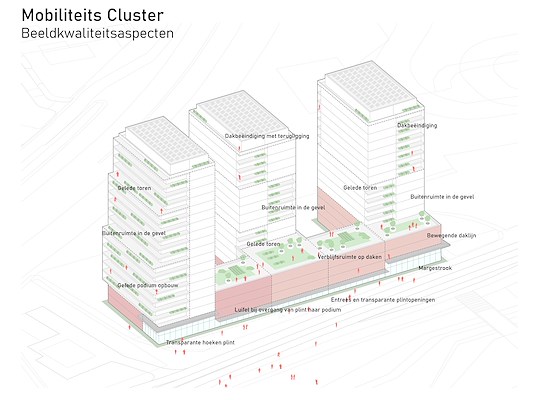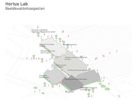 Ten tweede worden de hogere bouwdelen bij voorkeur uitgevoerd in lichtere tinten, zodat hoogbouw ‘wegvalt’ tegen de lucht. Ten derde sluiten de campusgebouwen voor Horti-Health en Horti-Tech in karakter en opzet aan op het bestaande World Horti Center in Naaldwijk: witte gevelpanelen, veel glas en accentvlakken van levend groen dat bij voorkeur vanuit de volle grond komt.