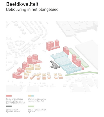 Essentie van het beeldkwaliteitsconcept voor de Flora Campus is om de grote maten van de bebouwingsclusters te verzachten en in kleinere korrel uiteen te laten vallen, vertelt Van den Hoek. Ten eerste dienen daartoe de plinten en podia gastvrij te ogen richting de openbare ruimte; bij voorkeur worden ze gerealiseerd me keramische materialen in vrolijke rood-oranjeachtige kleuren.