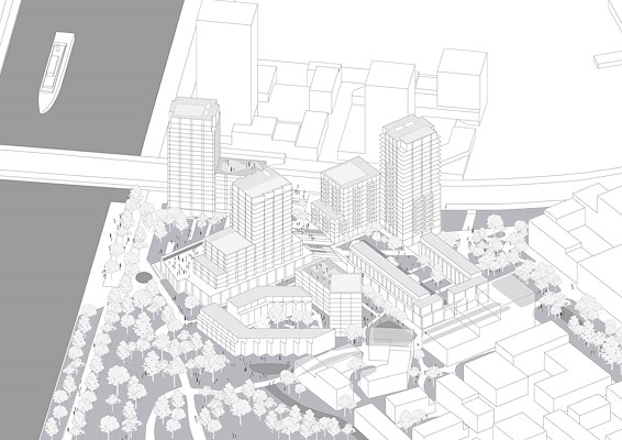 Met een verdraaiing in het stedenbouwkundig plan ontstaat een grootstedelijke ruimte aan het water, bedoeld voor de stad en de regio. Binnen het gebied bevinden zich diverse pleinen en hoven met een focus op wonen en werken.