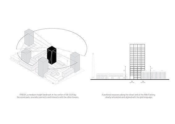 Fresh staat op een centrale positie tussen twee gebouwen die tot het erfgoed van de voormalige Campina-fabiek behoren; de Melfabriek en IJsfabriek. De architecten hebben ernaar gestreefd om een zo zorgvuldig mogelijke relatie tussen bestaand en nieuw te realiseren. In het ontwerp worden de aangrenzende fabrieken weerspiegeld in een ritmisch grid, ‘melkachtige’ tinten en materialen met een industriële textuur.