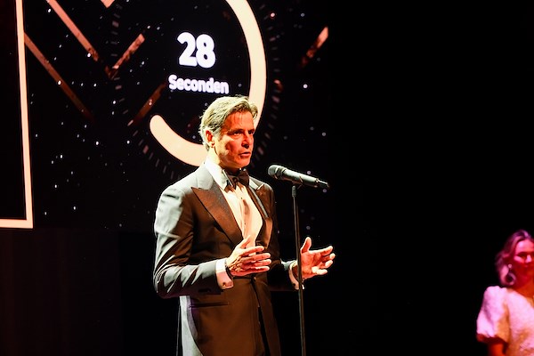 Dirk Aldenzee van Boon Edam doet de bedrijfspitch voor de zaal en jury tijdens de feestavond