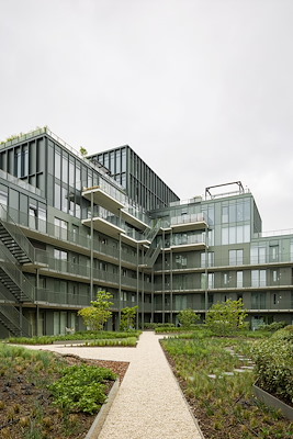 . Het bureau verzorgde de groene inrichting van de dakterrassen bij de penthouses, die tezamen een groene trapvormige ‘tribune’ vormen richting het dak. Ook ontwierp LAP de landschappelijk ingerichte binnenhof op het dak van de parkeergarage. Aan de achterzijde van het gebouw zijn de appartementen op de begane grond voorzien van een overtuin, een tuin die door een weg wordt gescheiden van de woningen.
