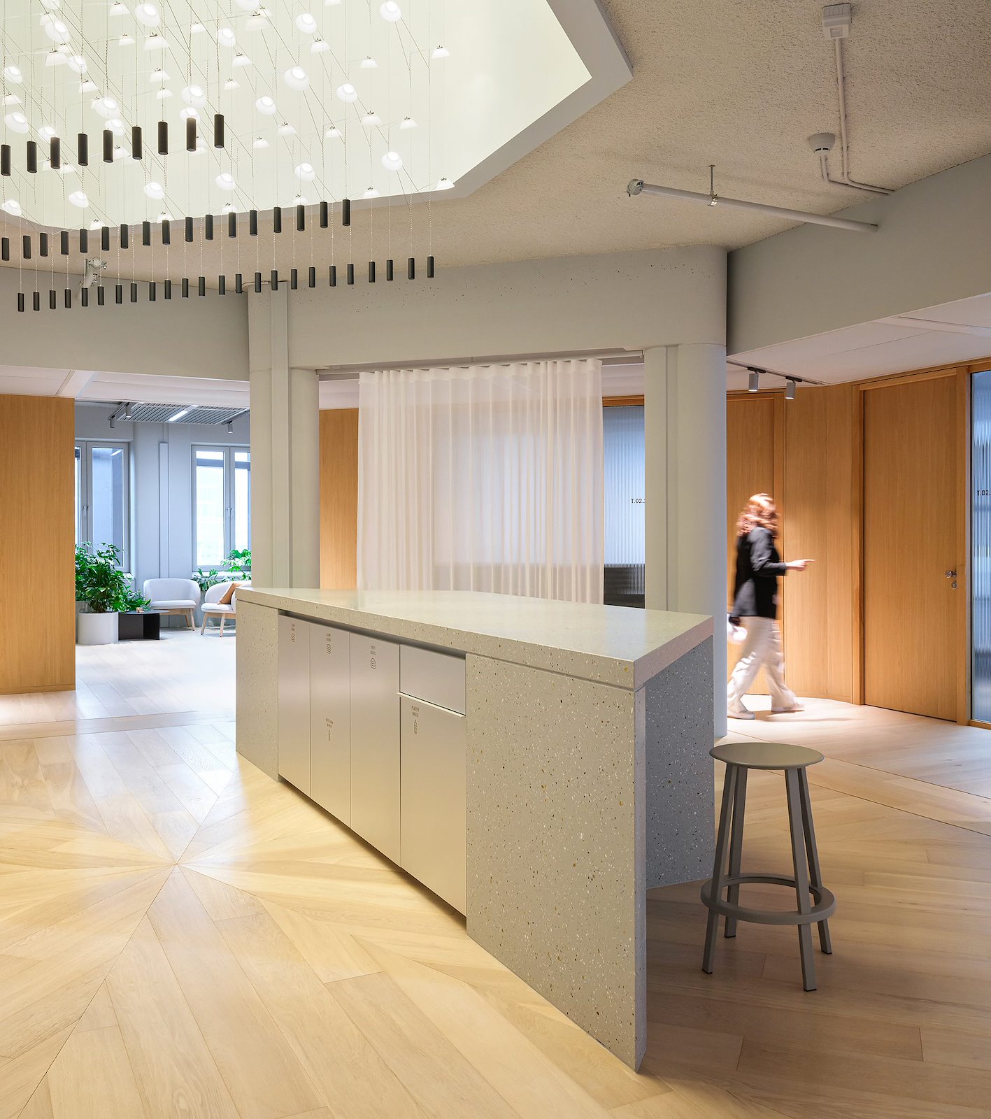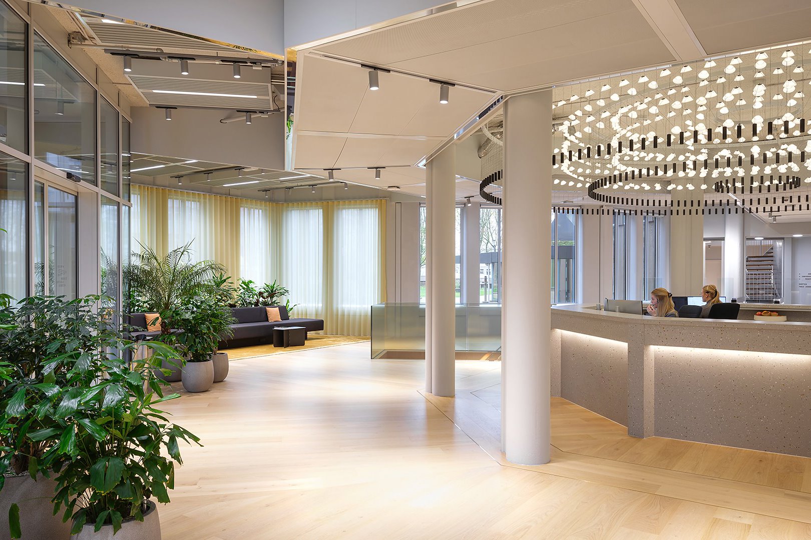 VanTot in samenwerking met Hollandse NIeuwe in totaal negen ‘kroonluchters’ ontworpen. Daar waar de atria dichtgezet zijn, zijn het lagere en bredere kroonluchters geworden. Daar waar er daadwerkelijk atria zijn, hangen er smallere en hogere kroonluchters. Om het licht een natuurlijke dimensie te geven, pulseert het rustig.