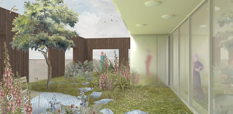 In de gemeenschappelijke daktuinen worden de wanden voorzien van mat-spiegelende beplating; op deze bijzondere plekken wordt daarmee de ervaring van het aanwezige licht en de lucht versterkt, en de bewoner krijgt daarmee de surrealistische ervaring van ruimte die zich tussen 'binnen en buiten' bevindt, legt het architectenbureau uit.