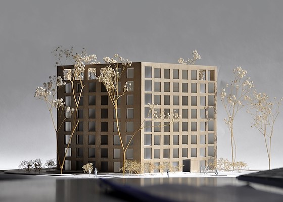 ontworpen alzijdig appartementengebouw dat letterlijk tussen de bomen staat.