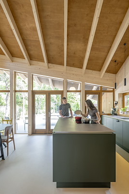 Het woonhuis is opgebouwd uit diverse hernieuwbare materialen. De hoofddraagconstructie bestaat uit een combinatie van HSB-gevelelementen, CLT-wanden en -vloer, en gelamineerde houten spanten. De gevelbekleding is uitgevoerd in FSC-gecertificeerd iroko hardhout en bamboe. De isolatie bestaat uit houtvezel. Dankzij de dampopen gevel komt de houten constructie extra goed tot zijn recht en ontstaat er een van nature aangenaam binnenklimaat, vertelt Natrufied Architecture.