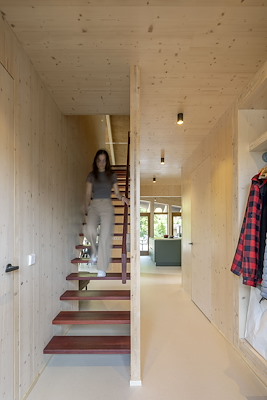 De gebogen gelamineerde spanten zijn door het hele huis zichtbaar en benadrukken overal de vloeiende vorm van het dak. De houten verdiepingsvloer bevat een duurzaam klimaatsysteem voor verwarming, koeling en ventilatie; daarbij wordt de gehele luchtbehandeling van het huis — zowel op de begane grond als op de verdieping — via de vloer wordt geregeld.