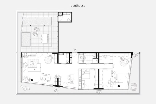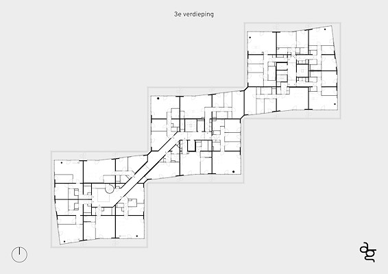 De middelste en hoogste toren krijgt halverwege een twist. “We gaven de plattegrond een zetje, verdraaiden ‘m iets zodat basis en top net van elkaar verschillen, terwijl de omhullende staalconstructie wel consequent wordt doorgetrokken. Van afstand wordt die verdraaiing zichtbaar doordat je op andere plekken door de hoeken heen kunt kijken: hier liggen hoekappartementen, maar niet tot aan de hoek”, leggen de architecten Arnoud Gelauff en Annemarie Swemmer uit. De collectieve woonkamer, de horeca en de entree komen in de basis van de middelste toren.