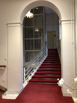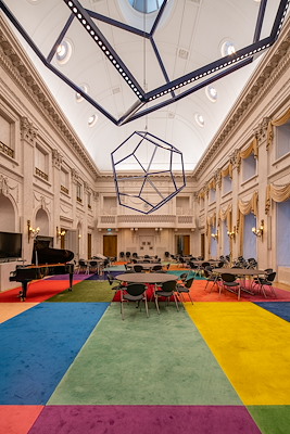 Het ontwerp van Pi voor de zaal begrijpt Janneke wel. “Na bijna twee eeuwen als plenaire zaal gebruikt te zijn, moest het in de jaren ‘90 iets heel anders worden, dus heeft hij er ook iets heel anders van gemaakt. Hij heeft er eigenlijk een heel eigentijdse zaal van gemaakt met expressieve kunstwerken in de vorm van het tapijt en de lichtarmaturen. Alleen… een historisch beeld is het niet.”