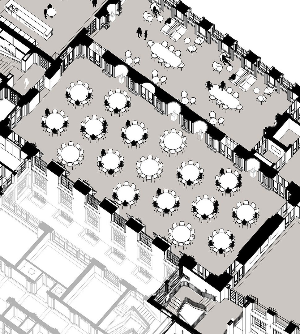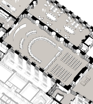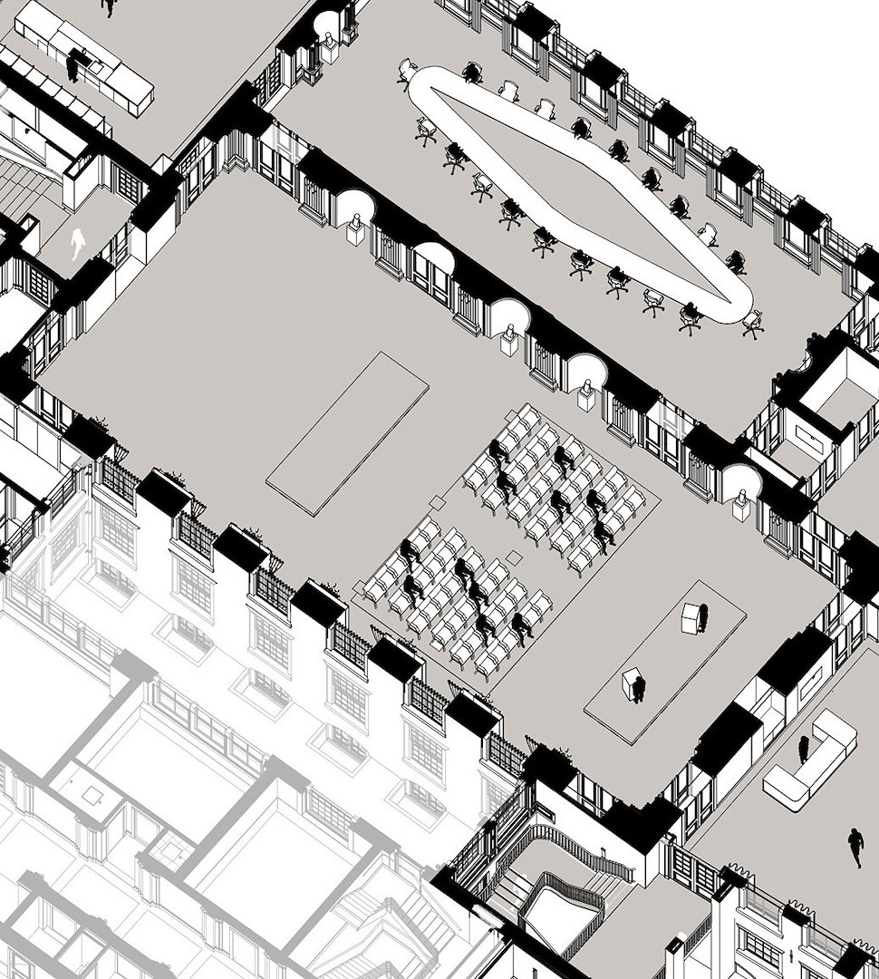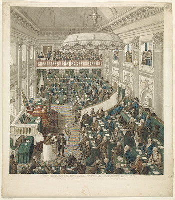 Interessant is dat bij de transformatie van balzaal naar plenaire zaal er eerst een tribune in de vorm van een brede U gemaakt is, maar dat dit later toch een lagerhuisopstelling werd om in het hart van de zaal meer ruimte te kunnen maken om te spreken, voor de ministers en de