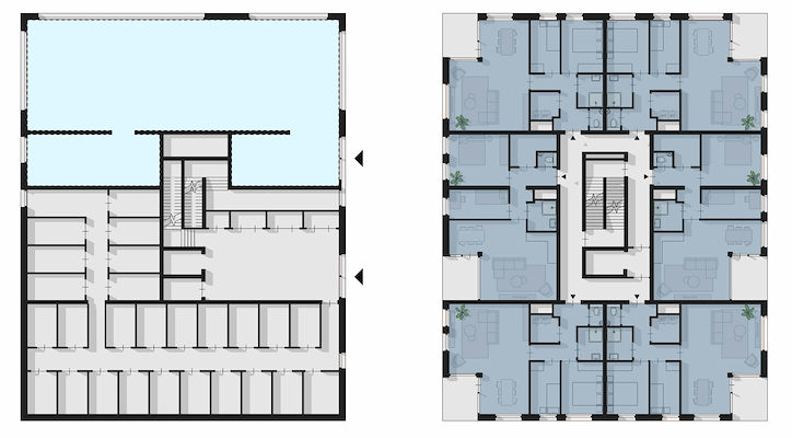 De hoeken van het bouwblok worden voorzien van accenten door de eerste verdieping te verhogen, wat het gevelbeeld versterkt en de woningen extra kwaliteit geeft. De hoge plafonds op de begane grond zorgen voor lichte en ruime leefruimten. Aan de westzijde koppelt het ontwerp twee woningen met extra hoogte, wat een sterk robuuste uitstraling oplevert.