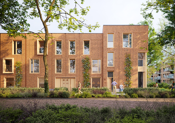Impressie noord- en westgevels grondgebonden woningen aan de parkzijde van de Meiboomstraat in een biodiverse en klimaatadaptieve omgeving