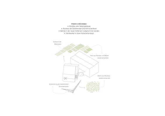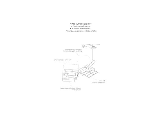 Om continu overnachtingen aan te kunnen blijven bieden, wordt de nieuwe berghut eerst naast de bestaande berghut opgebouwd, alvorens de oude berghut afgebroken wordt. Hout uit de oude berghut wordt uiteindelijk weer gebruikt als gevelafwerking van de nieuwe berghut. Hetzelfde geldt voor andere bruikbare materialen.