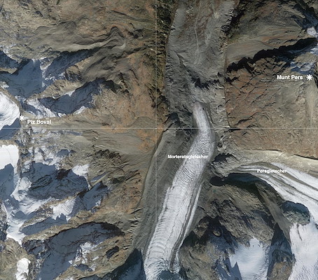 Vanaf de oostelijke helling van de Piz Boval heb je een prachtig uitzicht over de Morteratschgletsjer en de Persgletsjer daarachter. Op die magnifieke plek in het zuidoosten van Zwitserland heeft