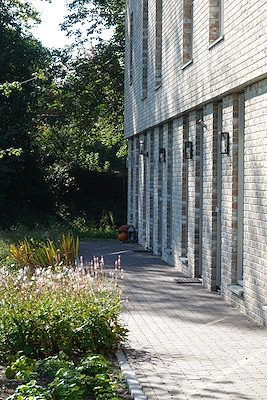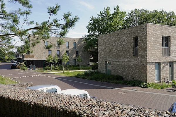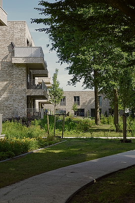 Centraal in het binnengebied staan twee drielaagse volumes met elk 21 appartementen. De gestapelde woningen zijn georiënteerd op het landschap en hebben royale balkons. Grote gevelopeningen zorgen voor doorzichten en daglicht. De baksteenarchitectuur sluit subtiel aan op het natuurrijke decor, aldus de architecten.
