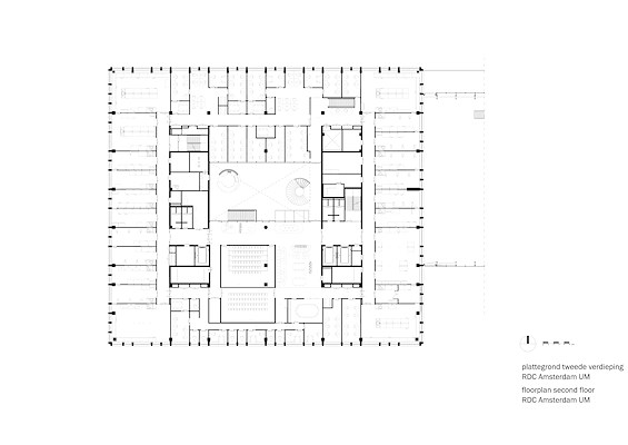 Het hart van RDC Adore bevindt zich op de tweede verdieping, in de vorm van een vier lagen hoge patio met een glazen dak. Dit binnenhof fungeert als de centrale ontmoetingsplek en brengt licht, lucht en ruimte tot diep in het gebouw. De vier verdiepingen worden verbonden door een in het oog springende wenteltrap, waarvan de organische vorm contrasteert met de lineaire opzet van het gebouw. Op de tweede verdieping ligt een flexibele congreszaal, waarvan het formaat kan worden aangepast aan de grootte van de groep die er bijeenkomt.