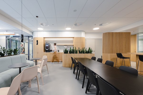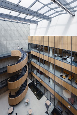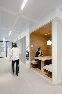 Atelier PRO heeft het gebouw in overleg met de gebruikers ingedeeld met concentratiewerkplekken, overlegwerkplekken, open werkplekken en kantoorvertrekken. Door deze mix kunnen onderzoekers snel schakelen van onderzoek in een laboratorium naar het werken aan een bureau, verklaren de architecten.