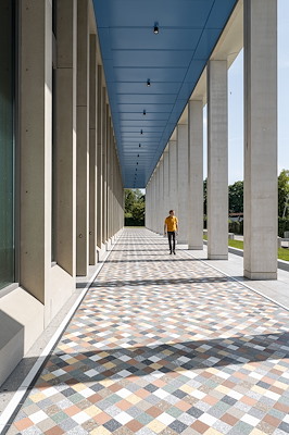 Aan de westzijde is als onderdeel van het grotere masterplan een colonnade in het gebouw opgenomen, die doorloopt rondom de binnentuin. In het interieur van RDC Adore koos Atelier PRO voor ingetogen kleuren en materialen; lichte tinten zorgen in combinatie met hout voor een rustige en warme sfeer.
