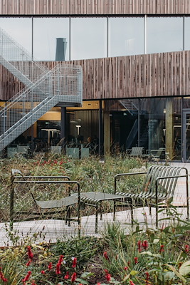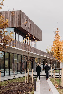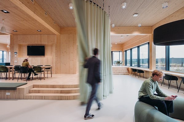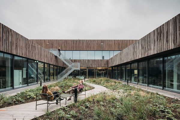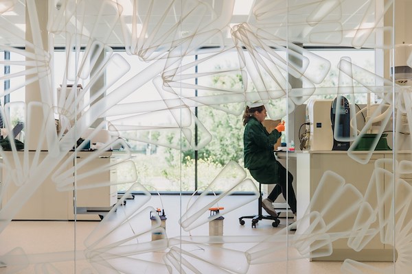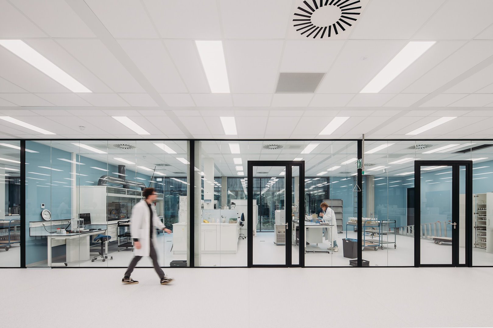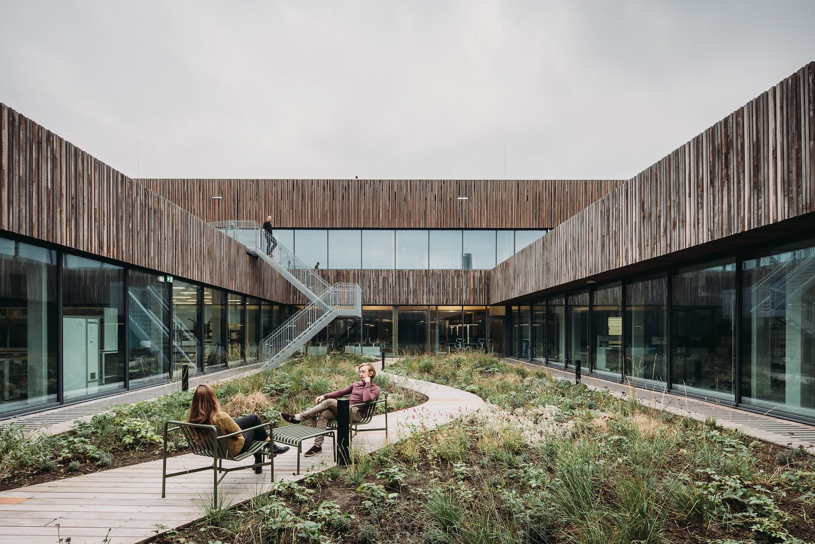 Middenin het gebouw, achter de entree, leidt een fraaie trap medewerkers naar de eerste verdieping, waar enkele vergaderruimtes zijn gepositioneerd, samen met een ruim restaurant dat zich opent op de daktuin bovenop de laboratoria.