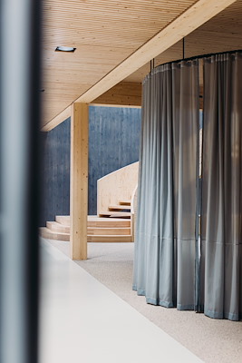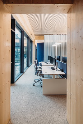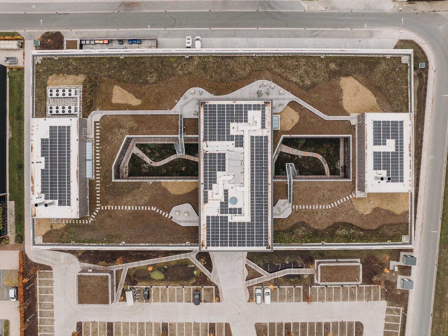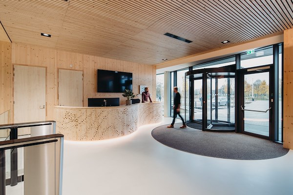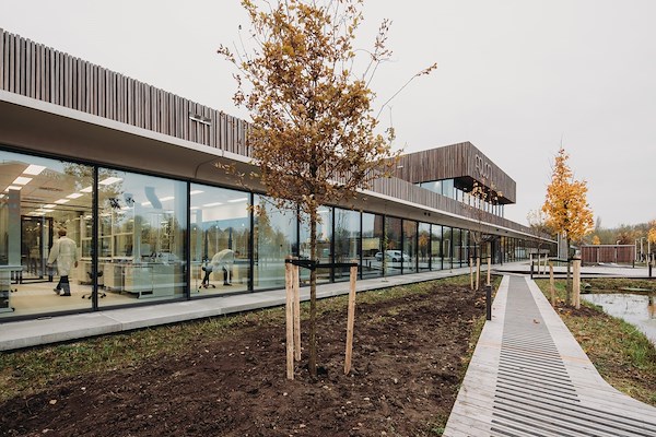 Zoals de lijn die een 8 omschrijft zichzelf in het hart kruist, zo heeft Vakwerk Architecten de middenzone van het gebouw ook die functie van kruispunt gegeven. Achterin het gebouw is dat de plek waar de watersamples afgeleverd worden. Voorin het gebouw is dat de plek waar de medewerkers binnenkomen. Tussen de entree en de expeditie ligt een open kantoorruimte, die zich aan weerszijden richt op de patio’s daar. Aan de ‘overzijden’ van de patio’s liggen, tussen de koelcellen in, nog twee kantoorruimtes die specifiek zijn ingericht voor geconcentreerd werk.