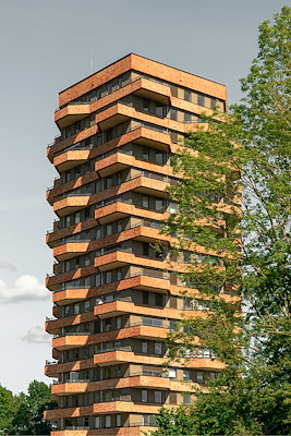 De gevel is opgebouwd uit bakstenen die zijn gemaakt van klei, rechtstreeks gewonnen uit de nabijgelegen rivieroevers. Het kleurenpalet sluit enerzijds aan bij de omliggende bebouwing en versterkt het visuele ritme, maar de ‘warme’ kleuraccenten geven de toren ook weer een eigen identiteit.