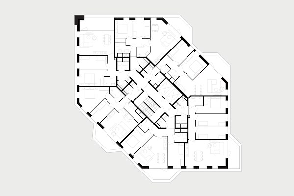 De verspringing van de balkons is ontstaan door variatie in de plattegronden. Deze flexibiliteit is mogelijk dankzij een structurele kern in diamantvorm die het gevelritme weerspiegelt, meldt Powerhouse Company. De indeling is zo ontworpen dat allesbehalve de kern aanpasbaar blijft, mocht dat in de toekomst wenselijk zijn. Toch gaat dit volgens het bureau niet ten koste van de kwaliteit: alle appartementen beschikken over hoogwaardige plattegronden met balkons die direct aan de leefruimte grenzen.