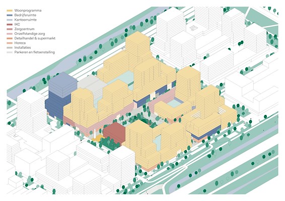 De gedachte bebouwing in de wijk bestaat uit doorlopende volumes met diverse hoogteaccenten. Door de afwisseling in schaal en functies moet elke straat een eigen karakter en dynamiek krijgen.
