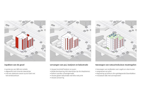 Het gebouw is ingepakt met een nieuw isolatiepakket en de gevels afgewerkt met minerale steenstrips met een lichte, warme uitstraling. Op de hoek met het winkelcentrum kwam een grote geabstraheerde zwaan in steenstrips overhoeks terug. De puien van de trappenhuizen en woningen zijn vervangen door nieuwe kunststof kozijnen in een warme tint met triple glas.