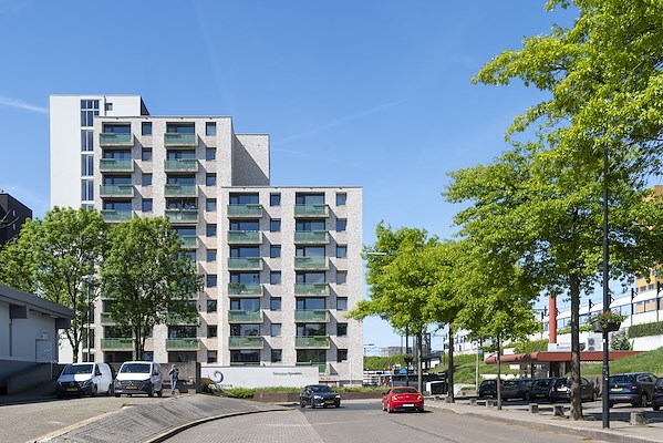 Markant kopgebouw met sociale woningen als 'aankondiging' van wijk Schuytgraaf