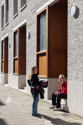 De nieuwe woonfunctie wordt duidelijk gearticuleerd via de entreezones, die gekenmerkt worden door een kleine trap en een uitgesproken houten entreeportaal. Dit versterkt de individuele identiteit en draagt bij aan de architectonische expressie, aldus WoonWerk Architecten. De trap die leidt tot de maisonnettes is een transitiezone tussen privé en publiek waar de bewoners in hun eigen plek aan de straat kunnen zitten. Aan de binnenkant van het blok wordt op een informele wijze ‘aan het steegje gewoond’.