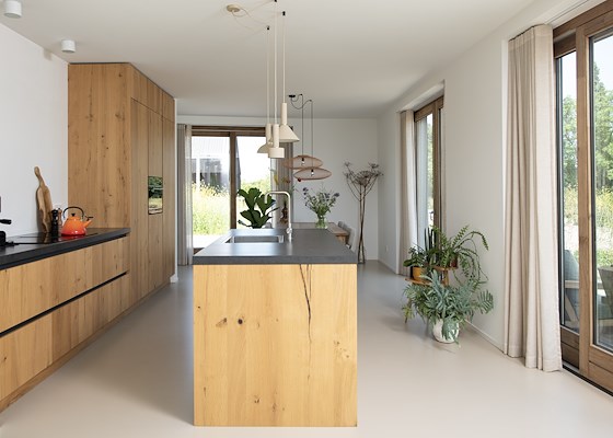 Aan de erfzijde zijn de keuken en eetruimte gesitueerd waarbij het aanrecht niet tegen de voorgevel is geplaatst waardoor ruimte is vrijgespeeld voor een grote schuifpui in elke ruimte. Een ingreep waarvan de beoogde interactie met het gedeelde erf profiteert.